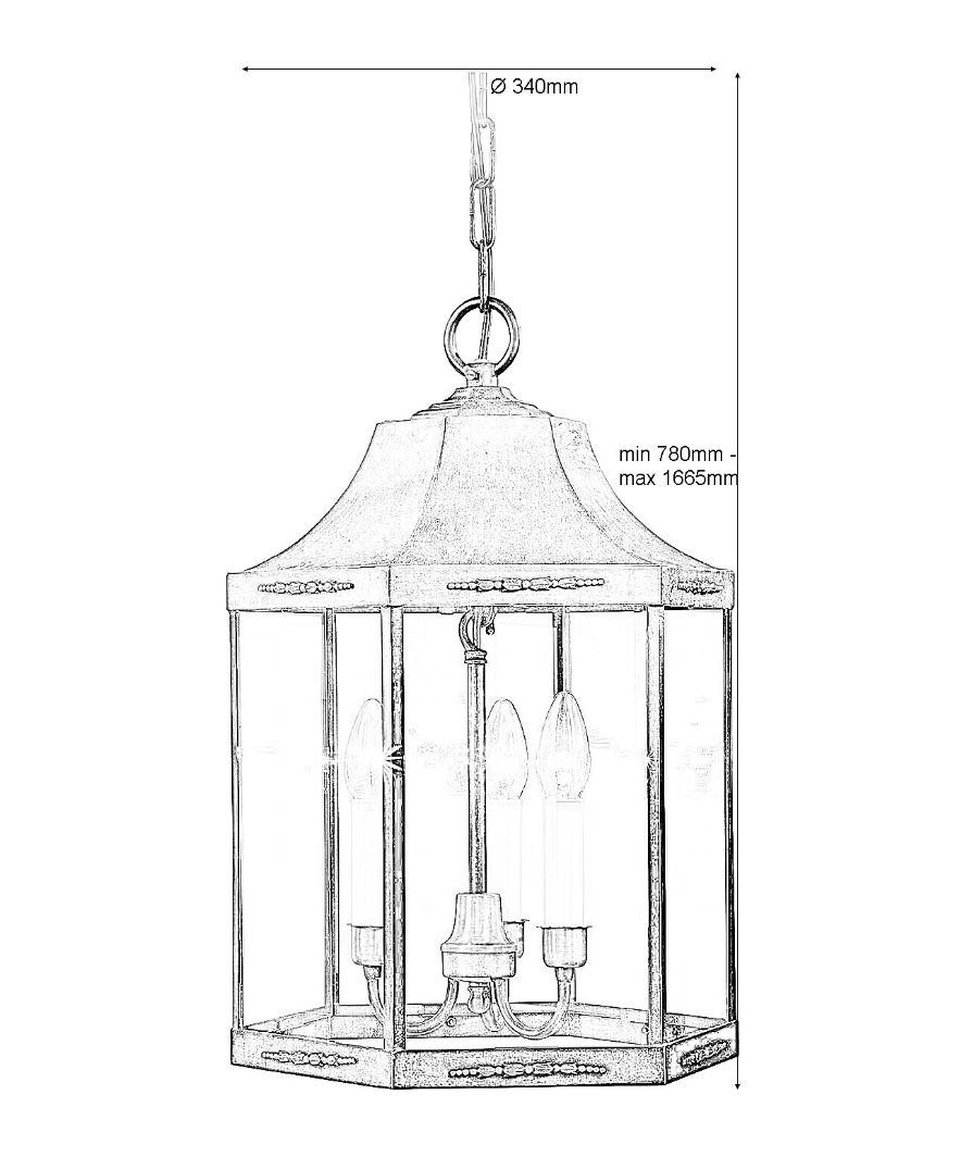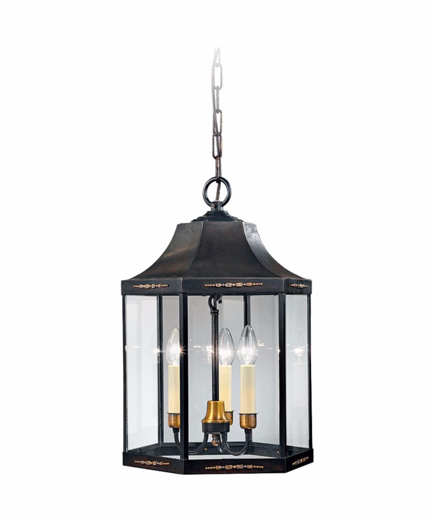Hand crafted brass lanterns shown in dark bronze finish with french gold details. The roof on these lanterns echoes the shape of veranda roofs.