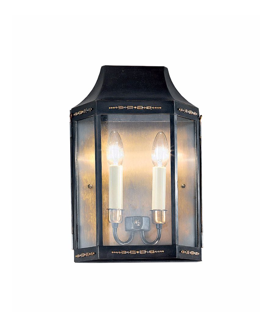 Hand crafted brass lanterns shown in dark bronze finish with french gold details. The roof on these lanterns echoes the shape of veranda roofs.
