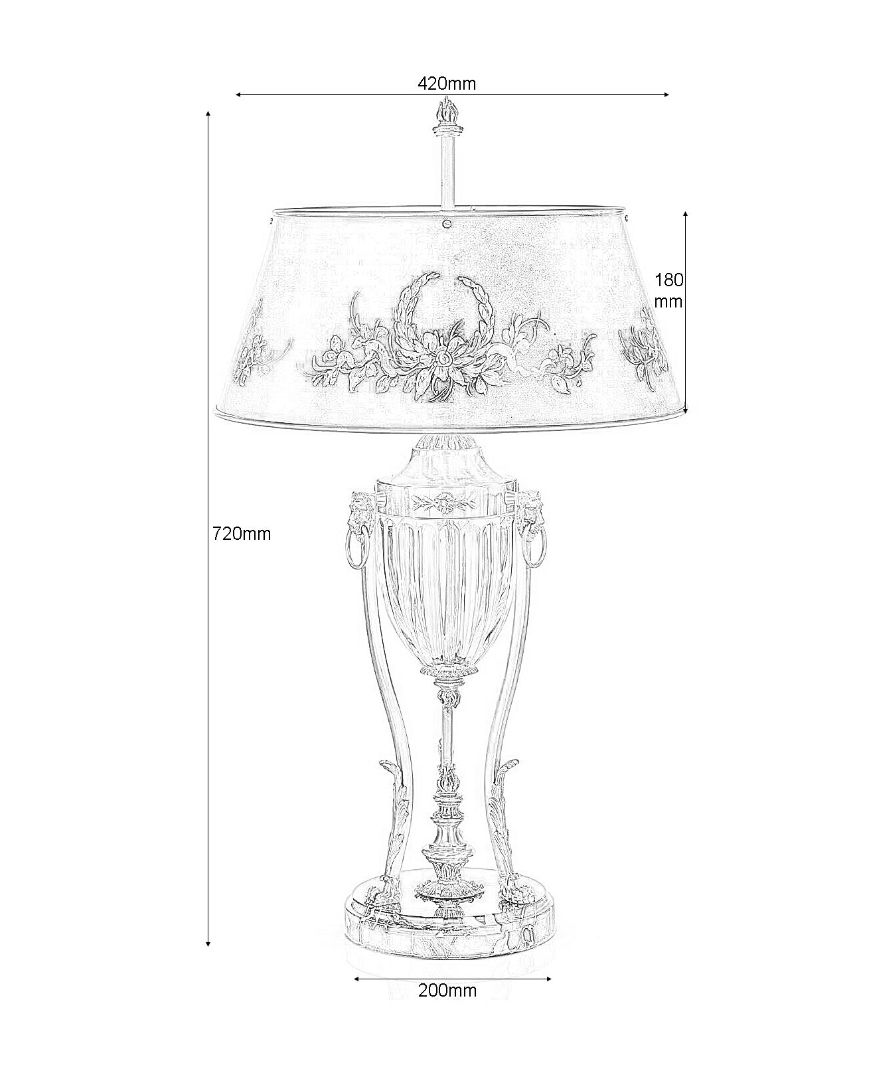 A crystal vase table lamp with a black and white marble base finished in french gold. The metal shade is hand painted in black with gold wreaths and floral design.