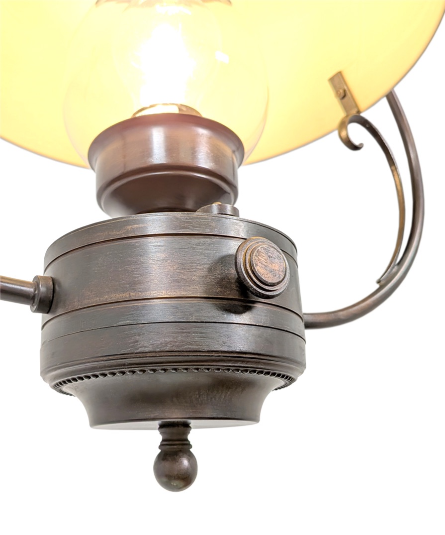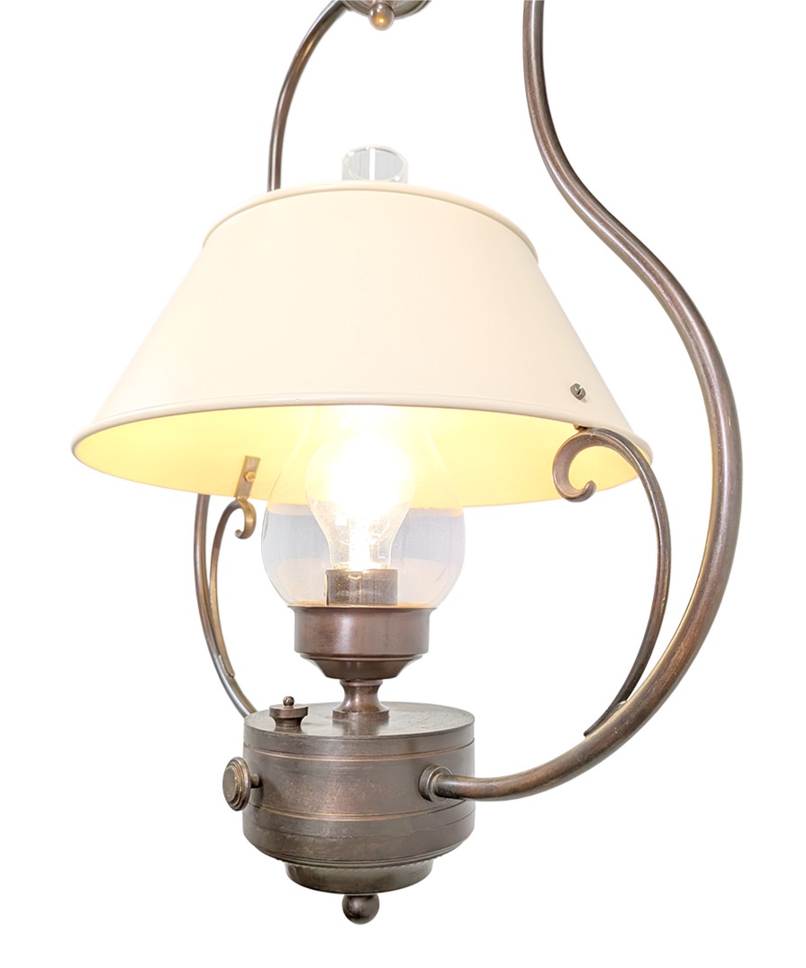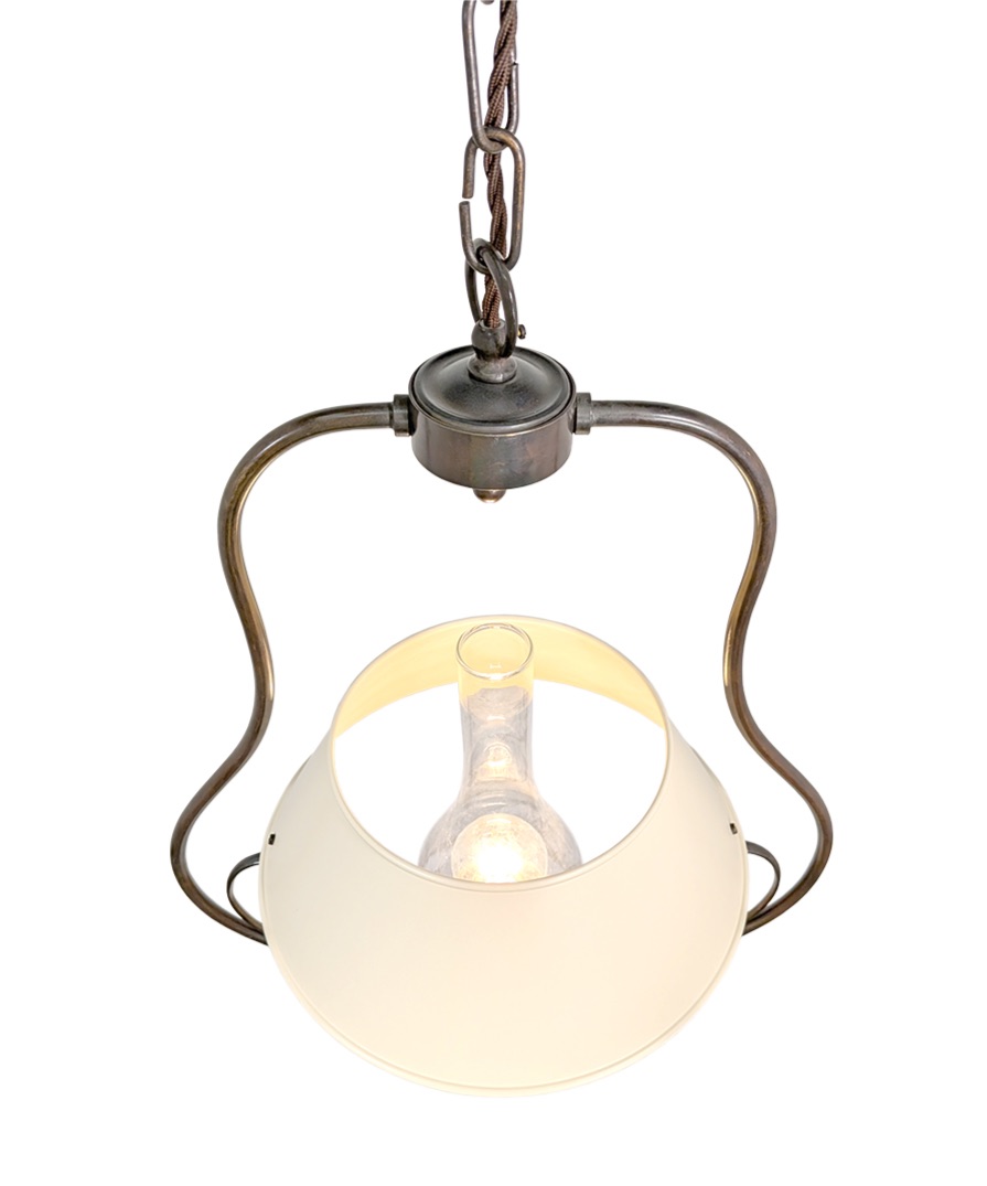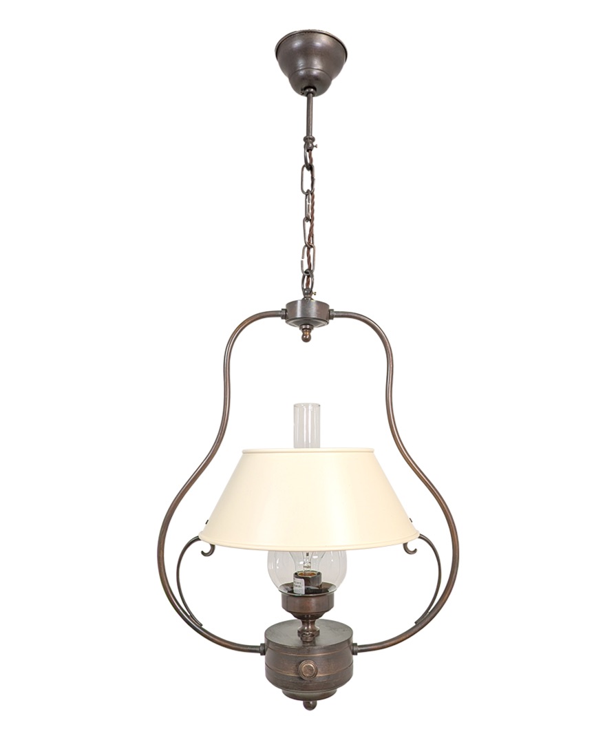 Influenced by the style of Victorian kitchens this oil lantern style pendant is made from solid brass and finished in an antique bronze. The shade is metal and painted in an off white finish.