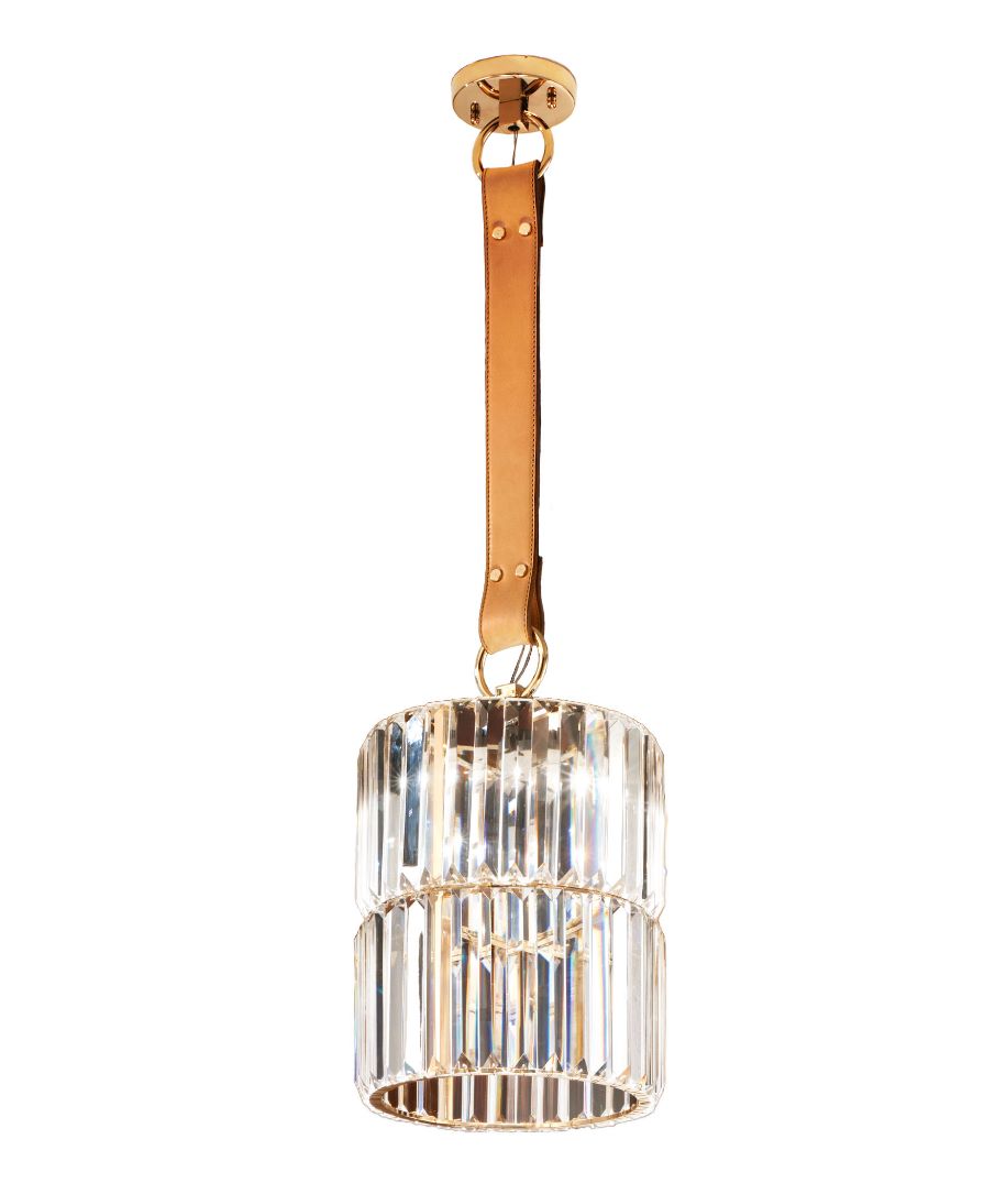 A crystal pendant with a tan leather strap in a shiny real gold plated finish and clear crystals. also available with a chain .
