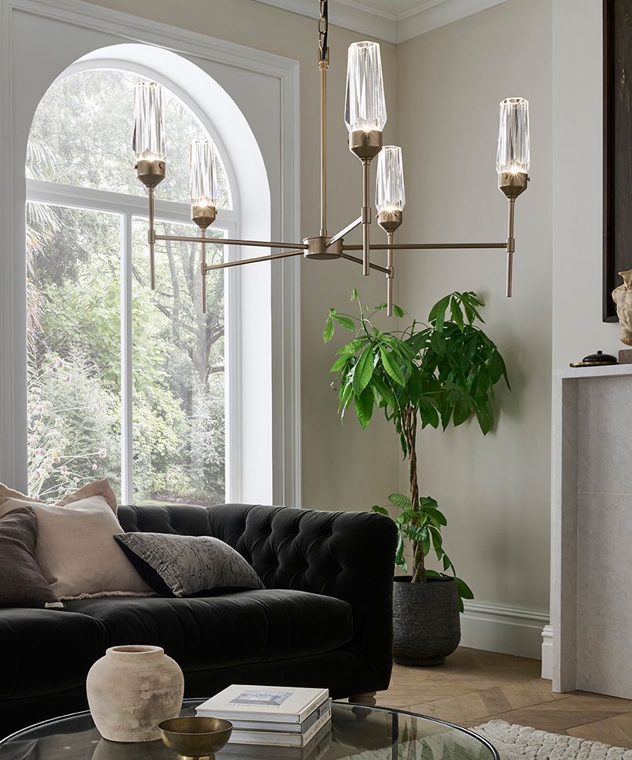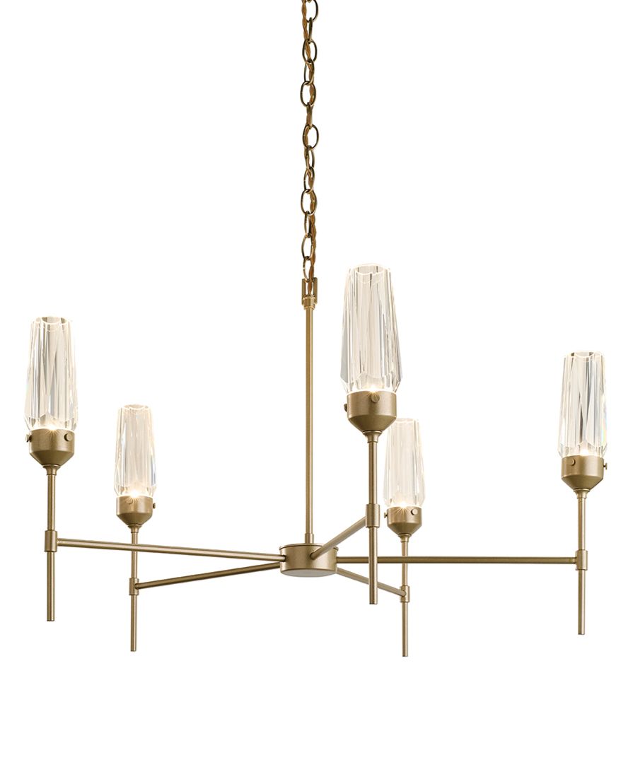 A five arm pendant with flute shaped faceted crystal glasses. Finished in Soft Gold with an adjustable chain suspension. Please Note: Other finish options are available on request.