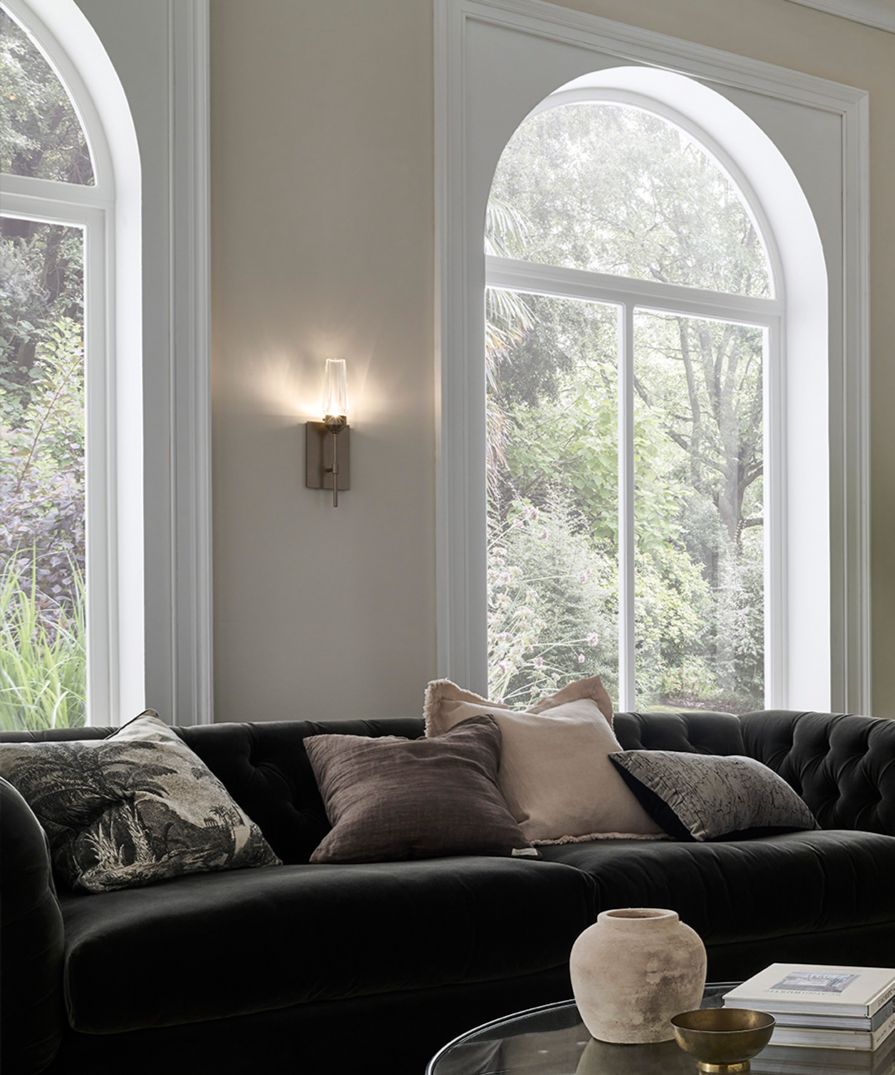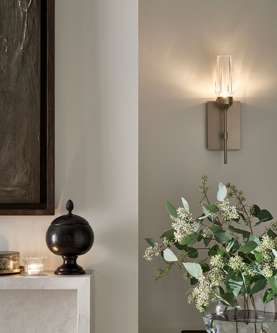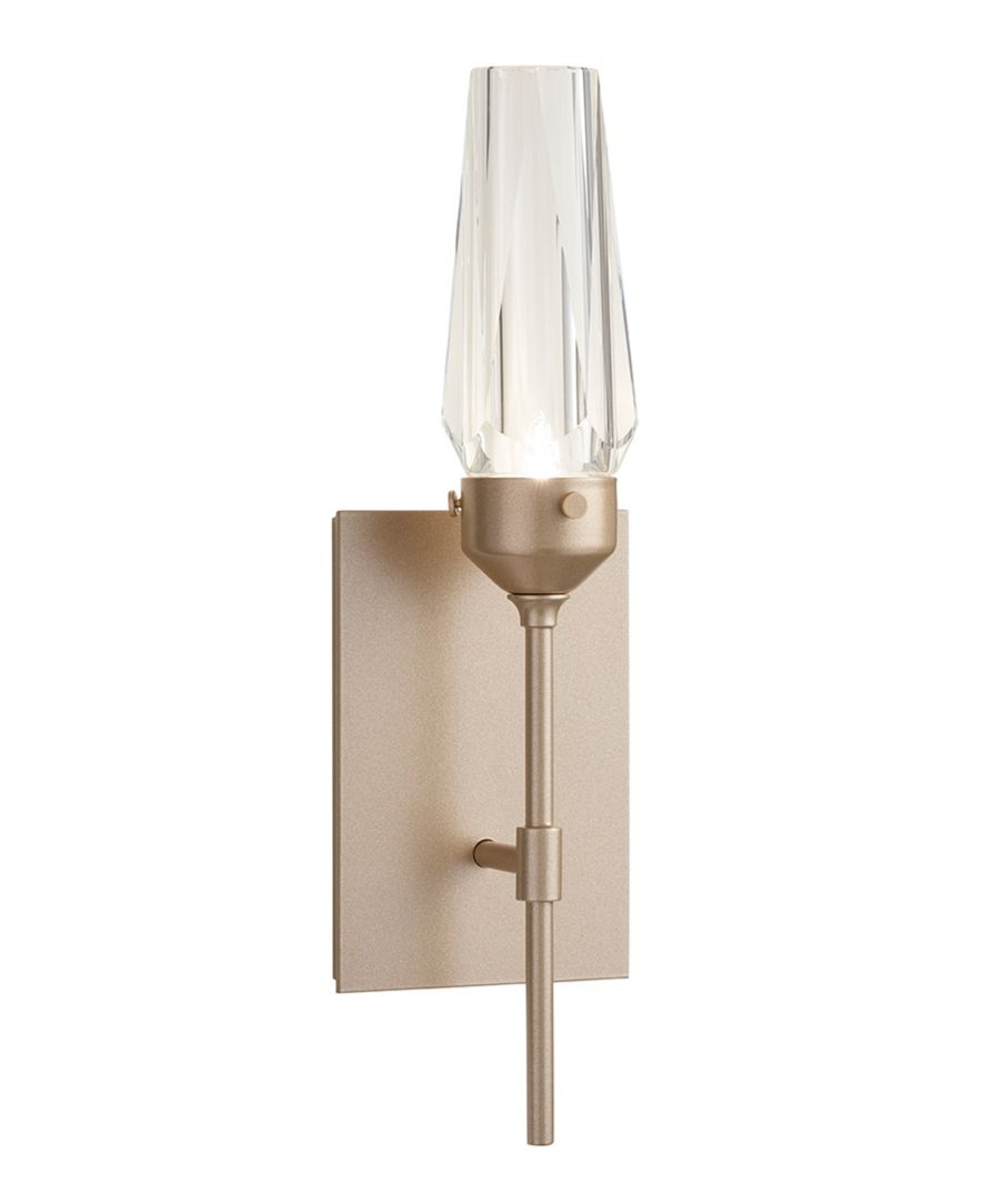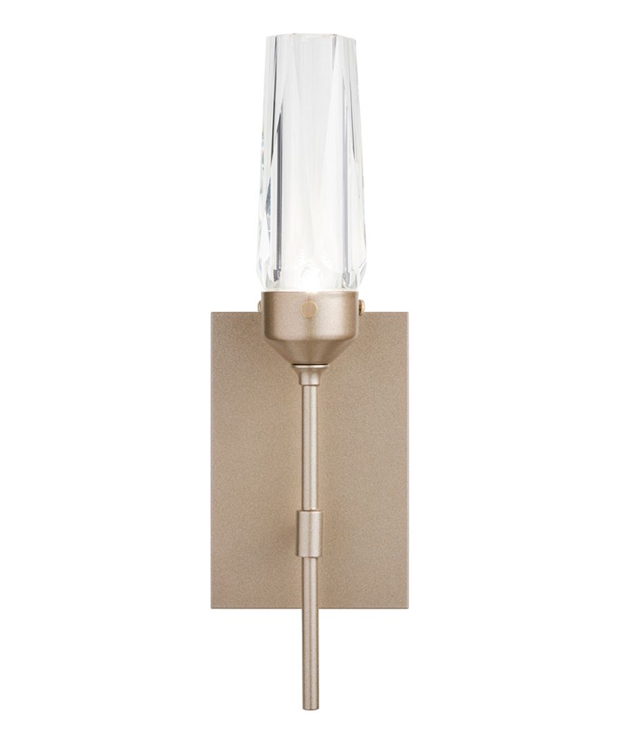 A single arm wall light finished in Soft Gold with flute shaped faceted crystal glass. Other finish options are available on request.