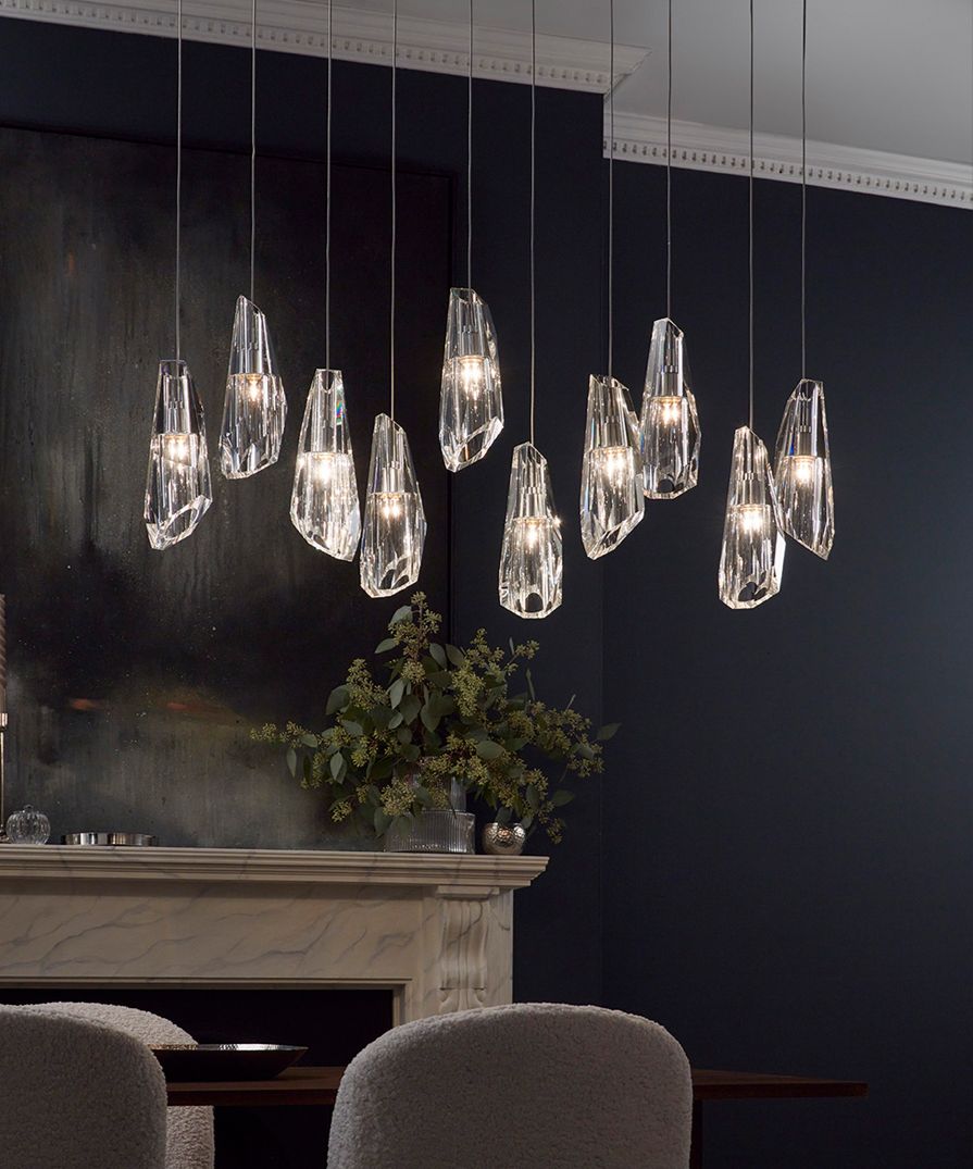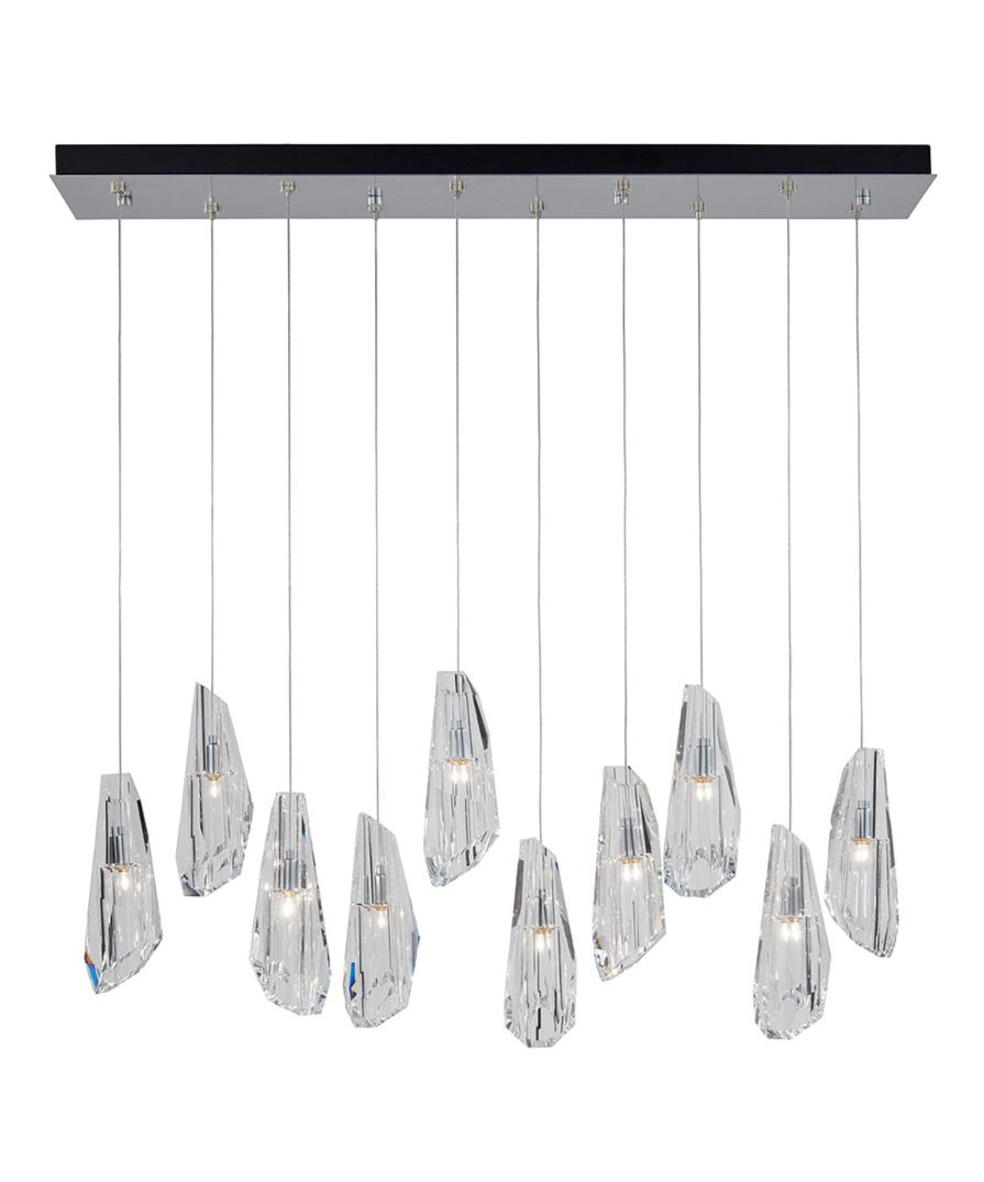 A linear ten light pendant cluster featuring two rows of large stunning hand-cut polished crystals which can be hung at the same level or staggered. Finished in Sterling, this gorgeous pendant is also available in other finish options on request.