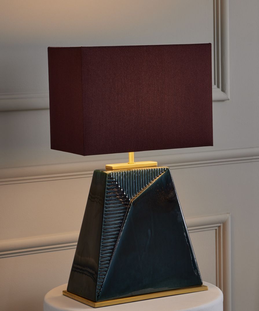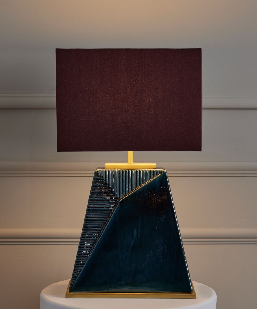 A stunning statement table lamp in a blue glaze finish with copper flecks from the firing process, making each piece unique. Satin gold base. Also available in a gold leaf finish. Please note: Lamp shade not included.