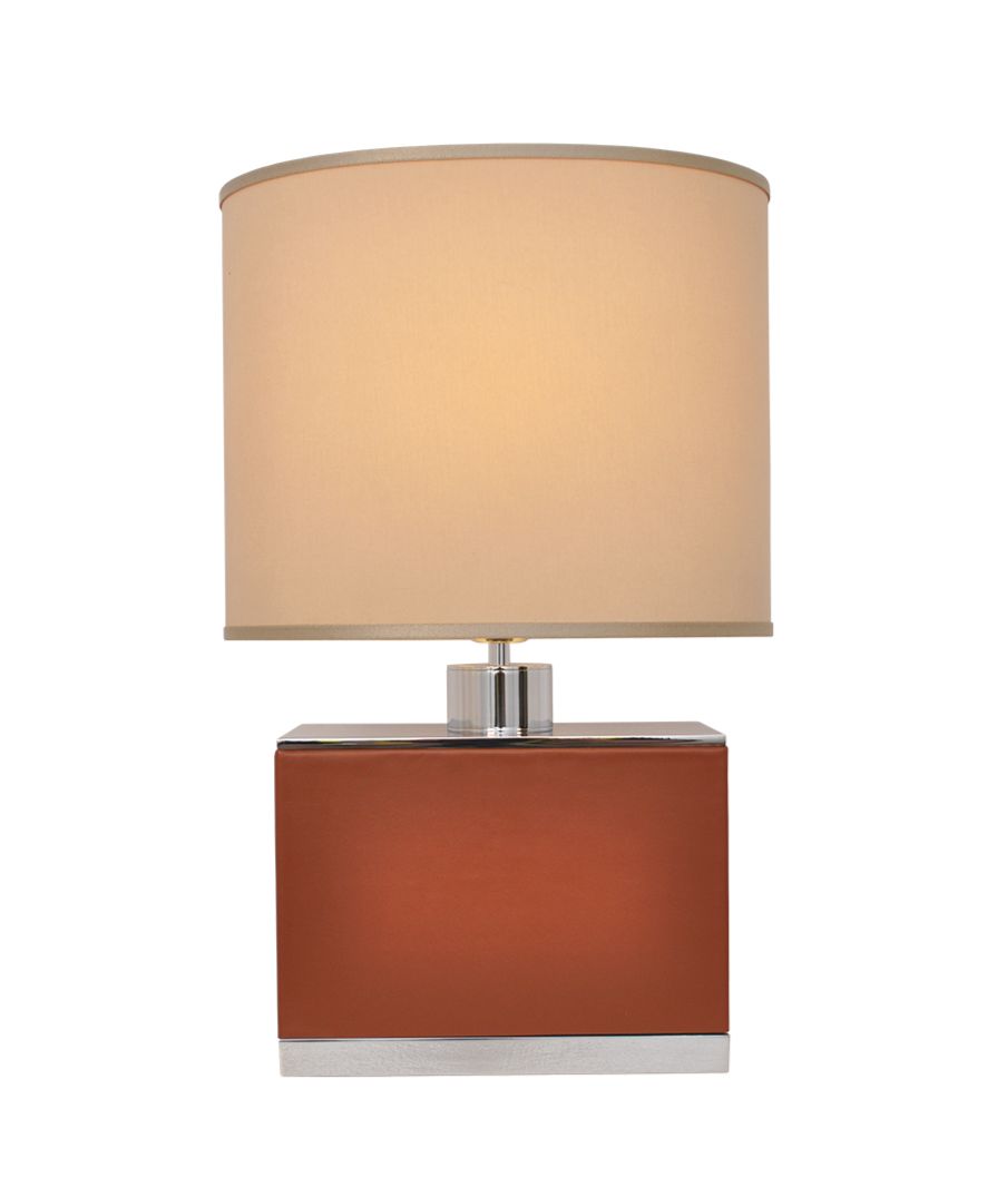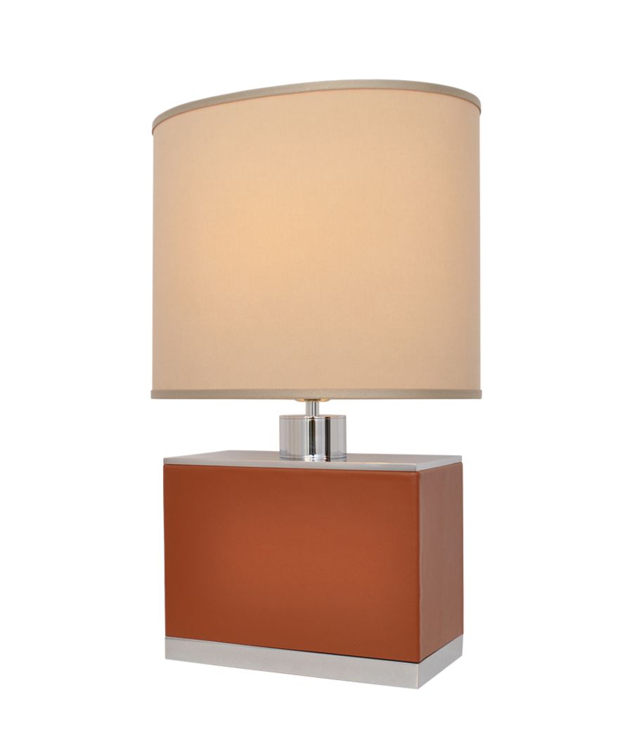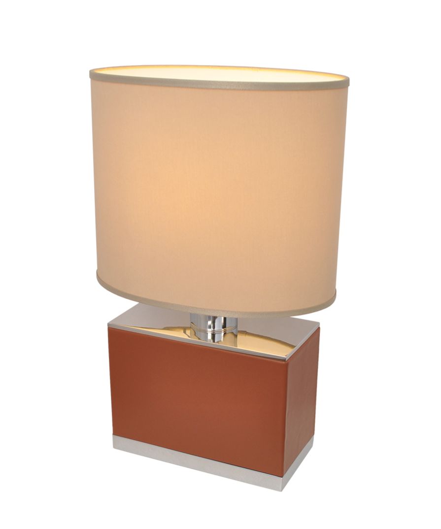 A classic brass table lamp covered in a light brown faux leather, finished in polished nickel and supplied with white chinette shade. Please Note: Lamp shade not included.
