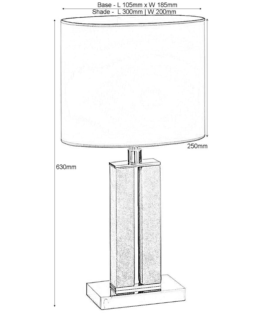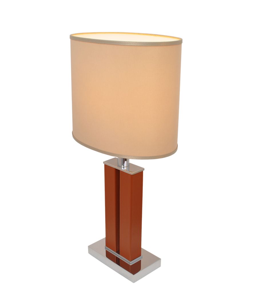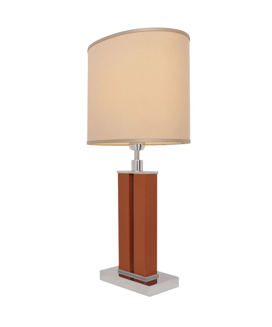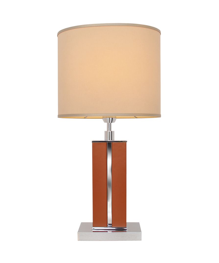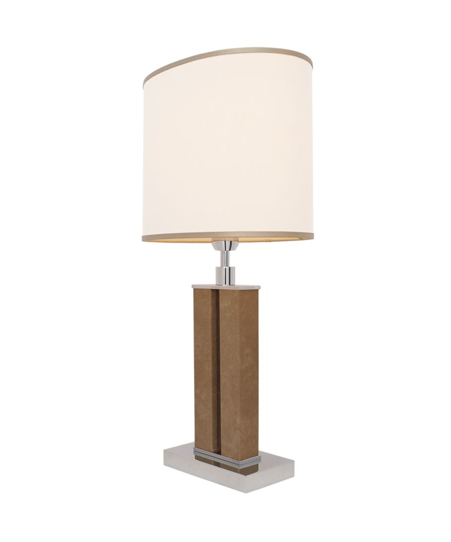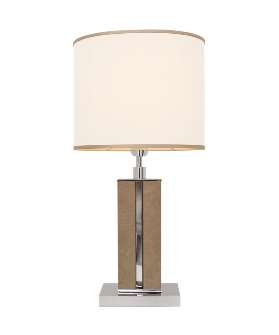 A dual-column brass table lamp wrapped in light brown faux leather, finished in polished nickel, and supplied with a white chinette shade. Please Note: Lamp shade not included.