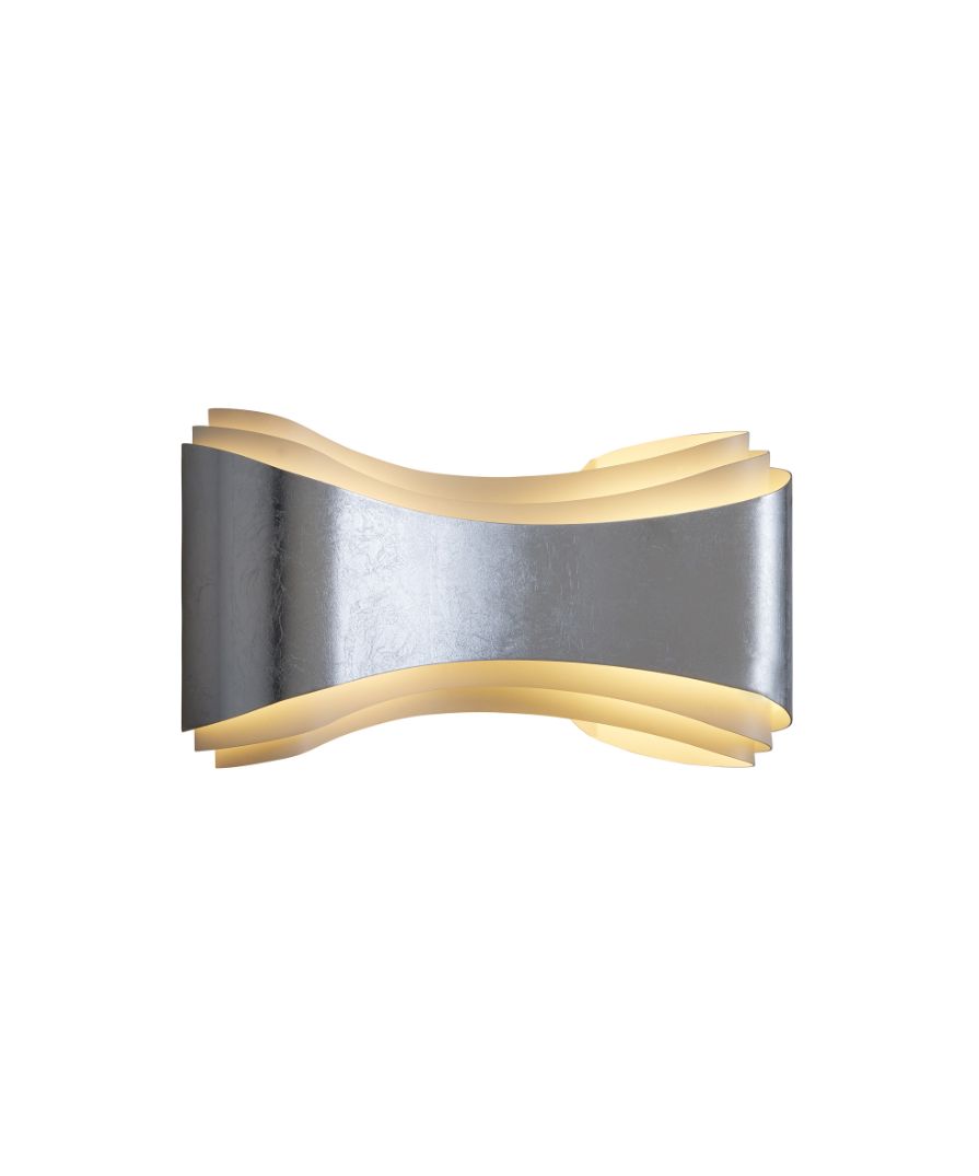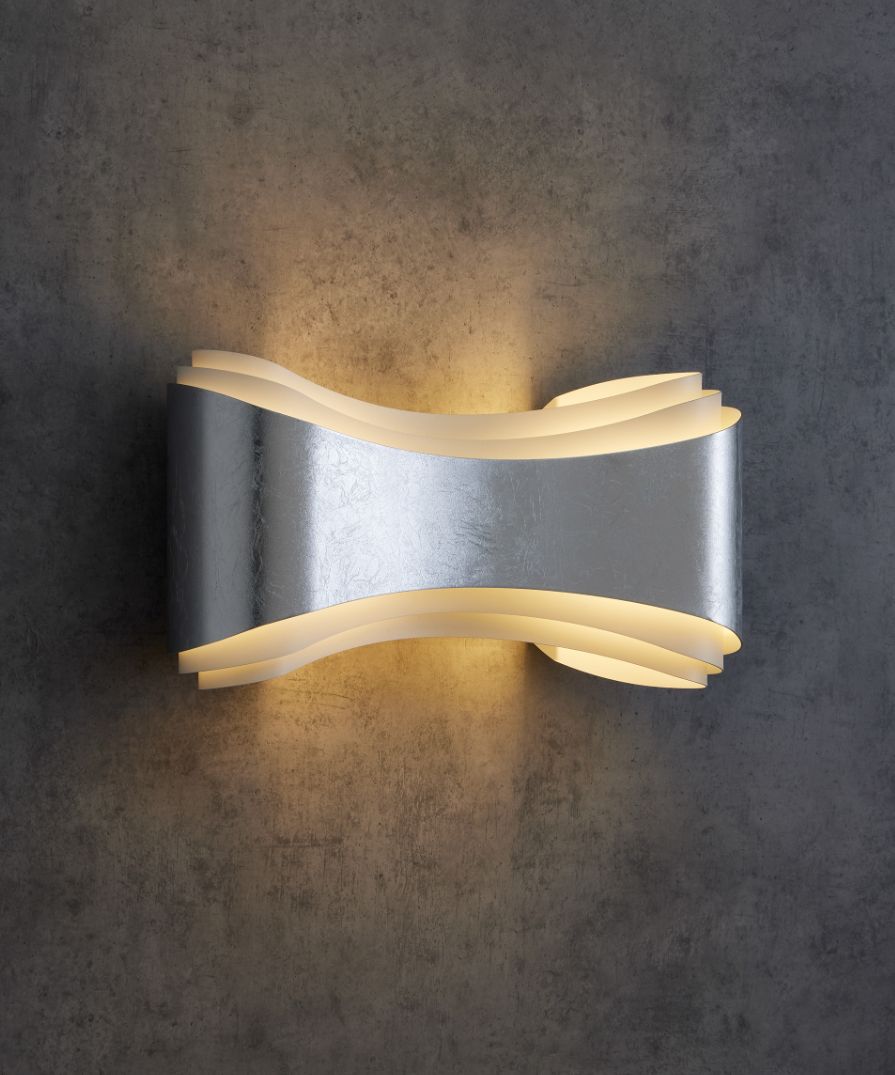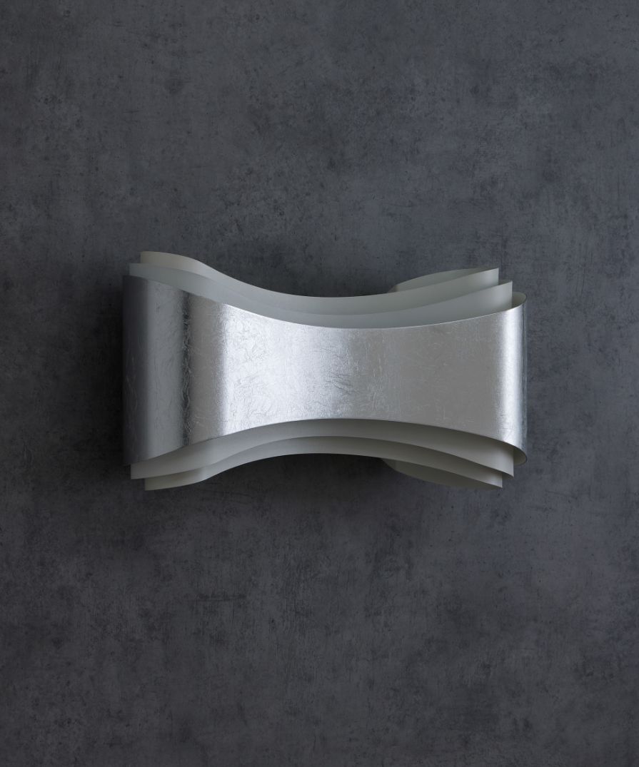 Small wave wall light with a white finish and a silver leaf centre. Its curved design creates a warm, elegant glow for any space. This is available in various finishes.
