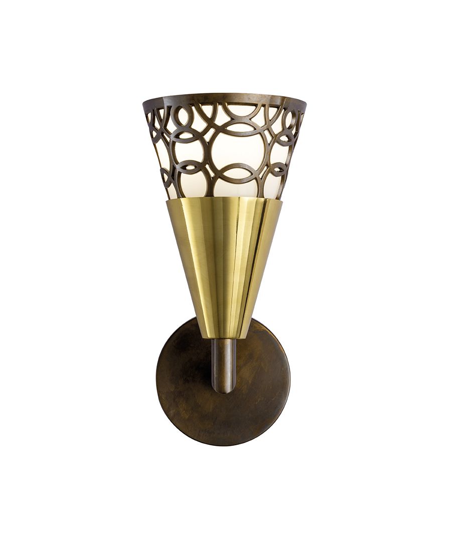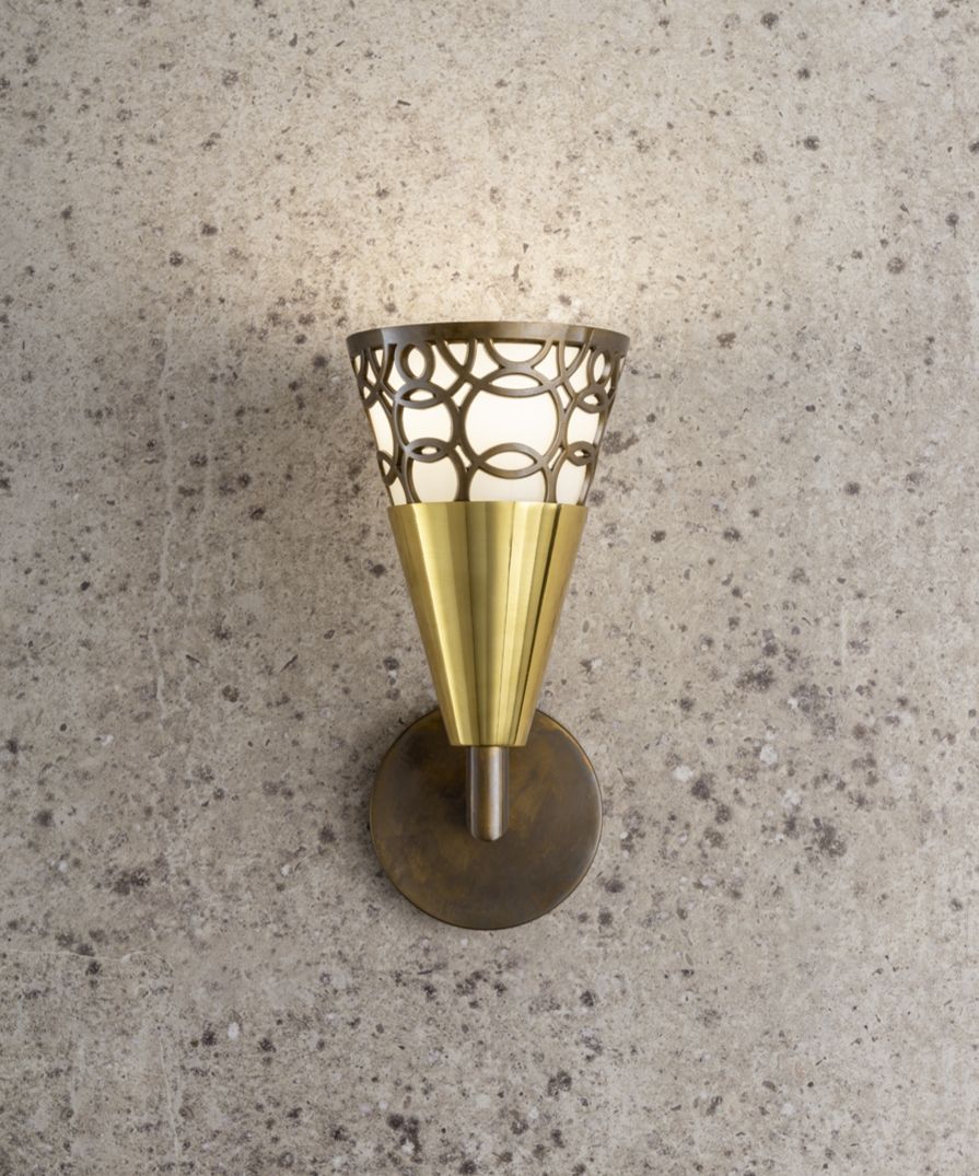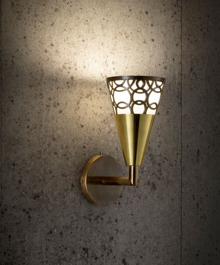 The Amalfi wall light features a unique conical design with a brass finish and intricate cut-out detailing. It showcases a mix of polished nickel and shiny French gold finishes. Please Note: Other finishes are available on request.