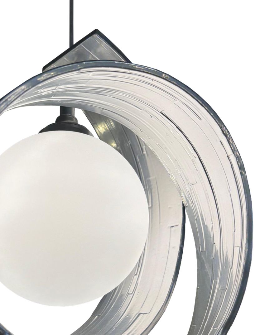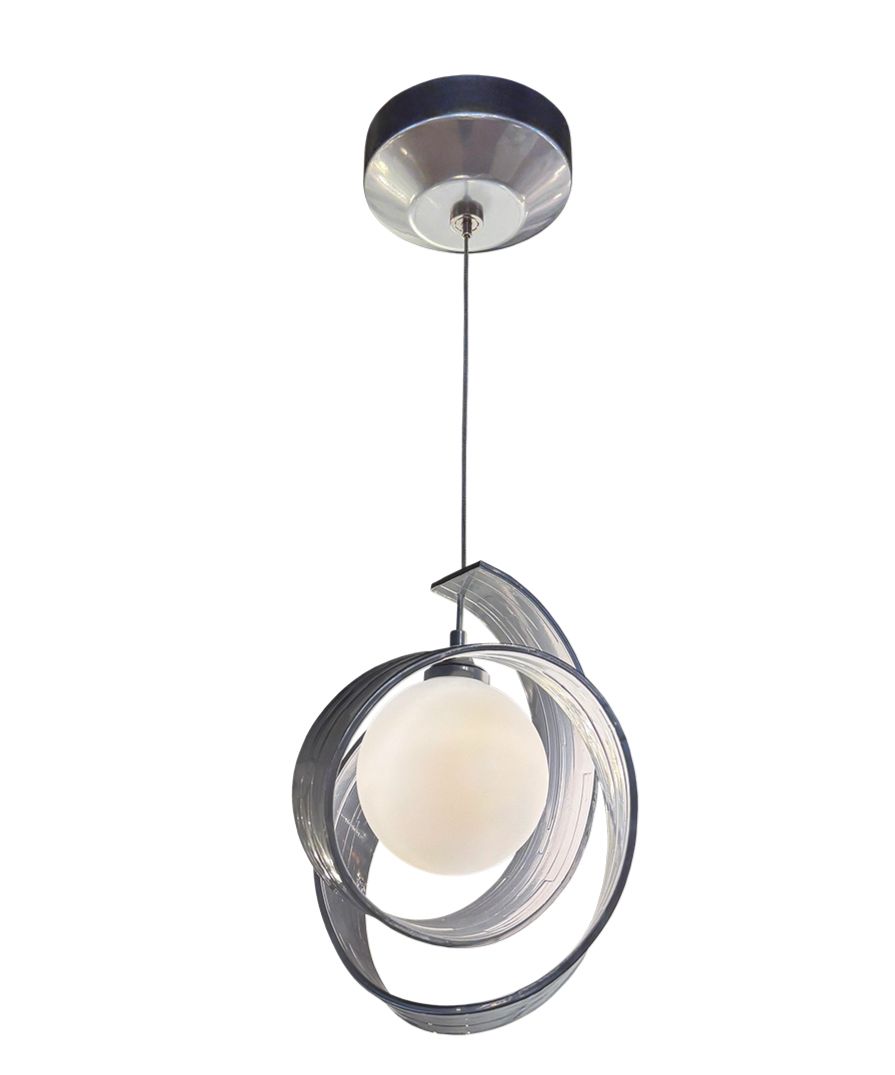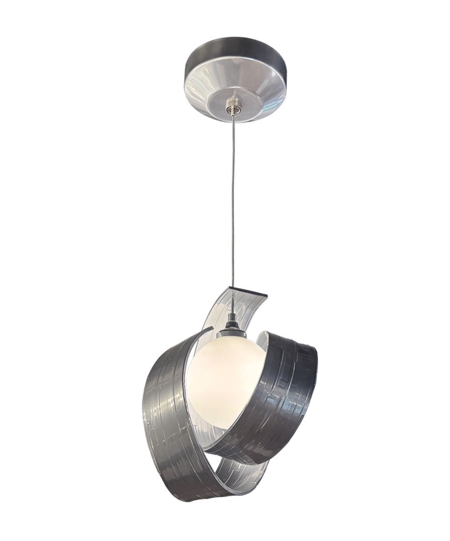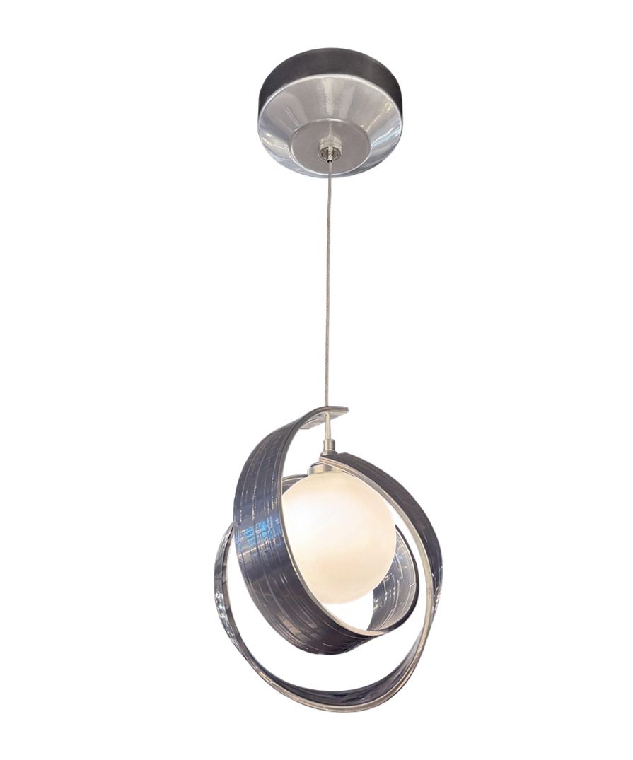 A aluminium texture metalwork pendant designed using a forged process to create a ribbon effect. This single pendant has an opal glass in the centre and is finished in Sterling. Please Note: Other finish options available on request.