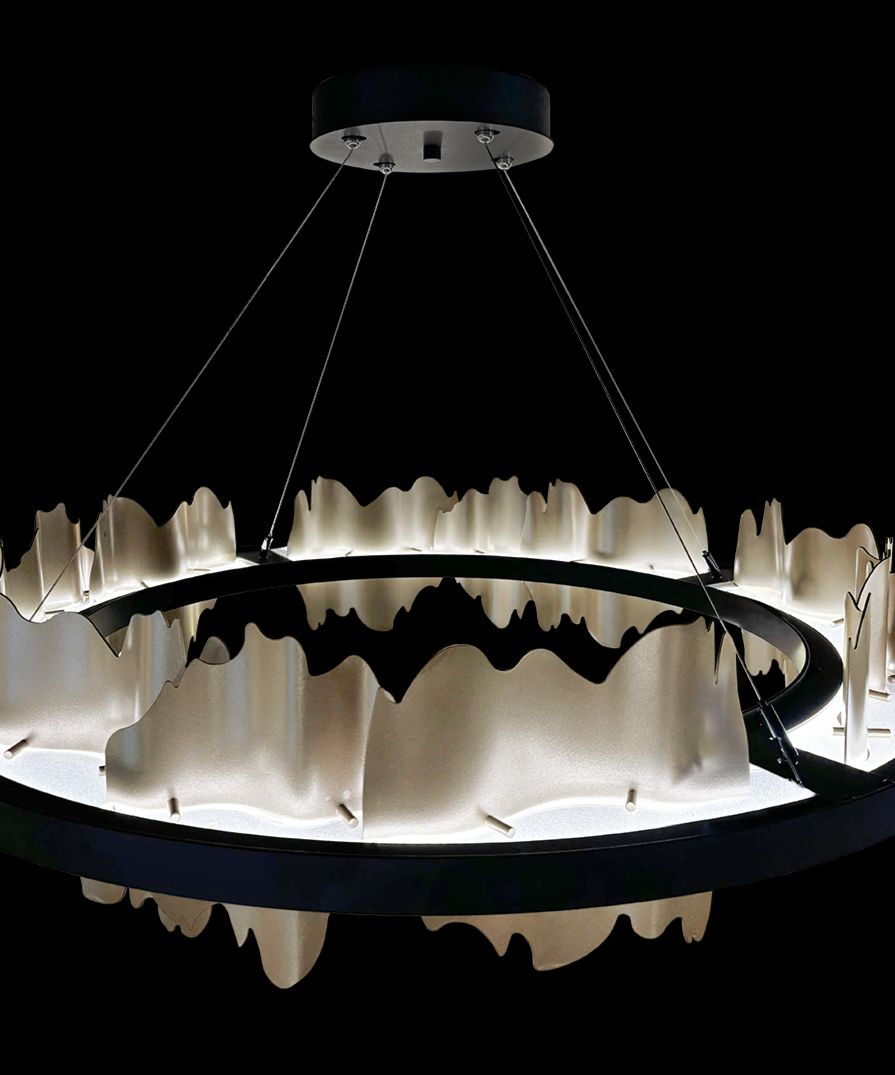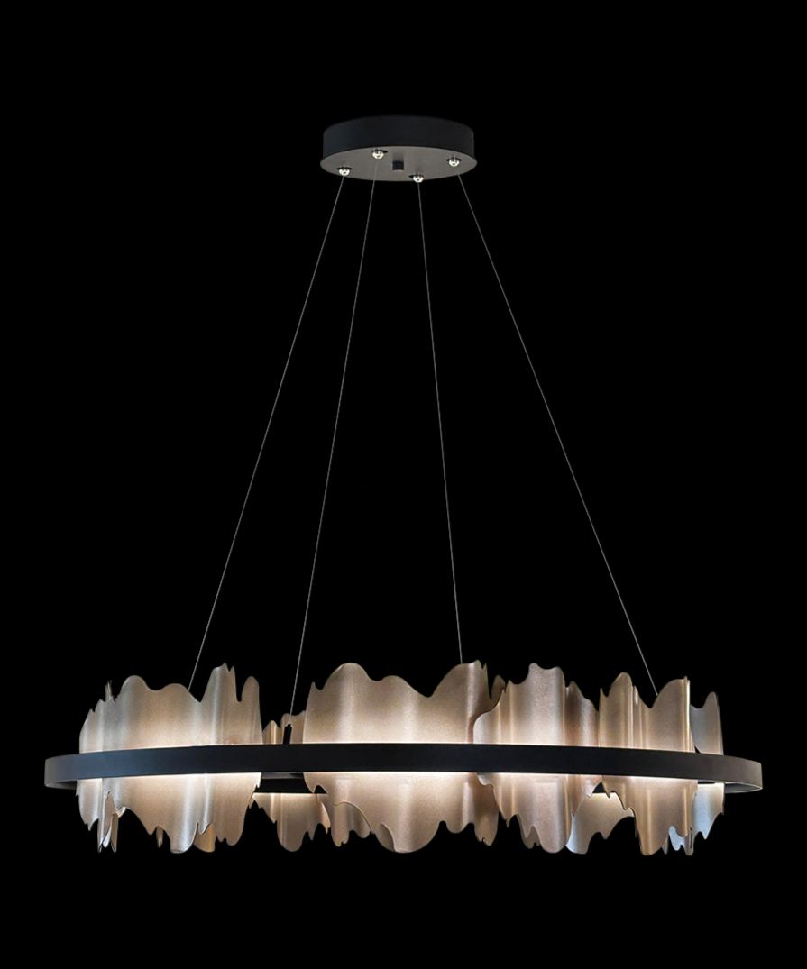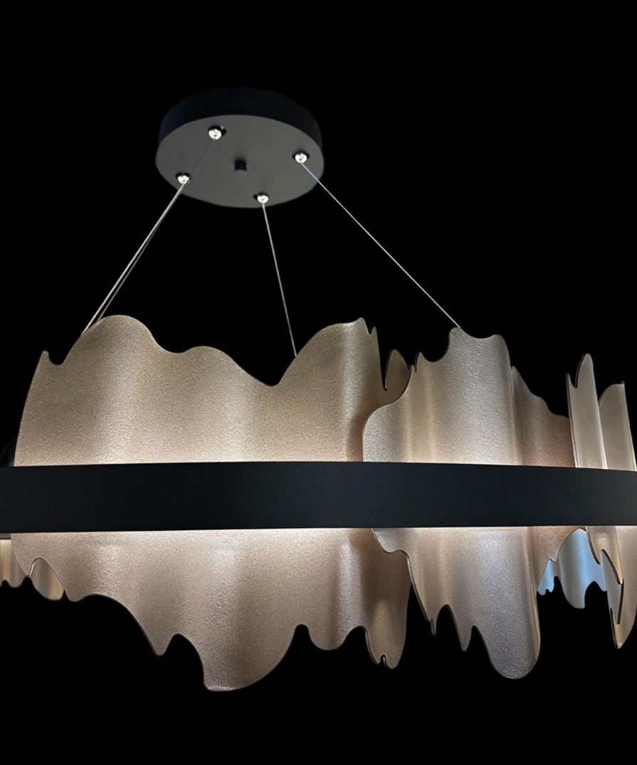 A circular pendant frame encases the discreet LED which illuminates light onto the curved metal plates designed using a forged process. The Ripple pendant is finished in Black with Soft Gold ripples . Other finish options are available on request.