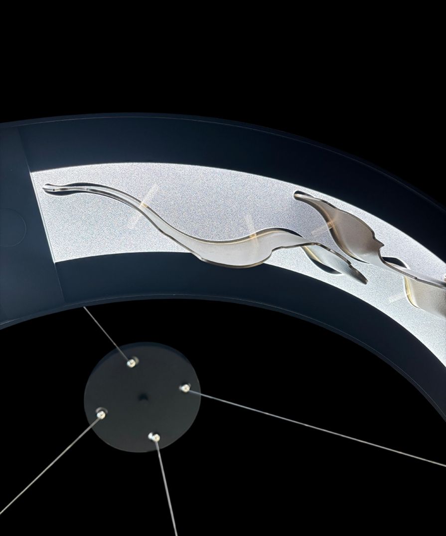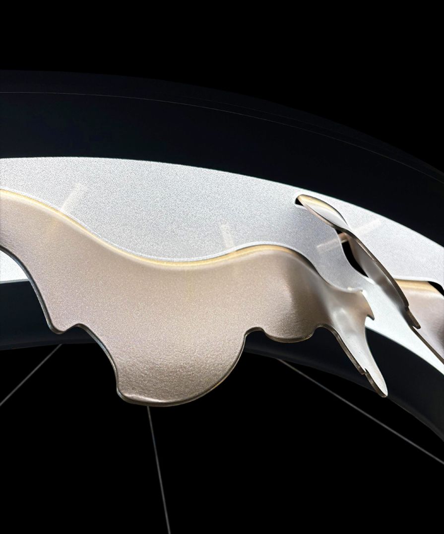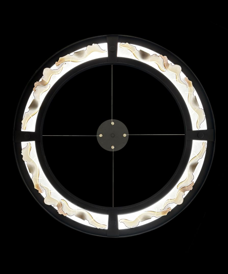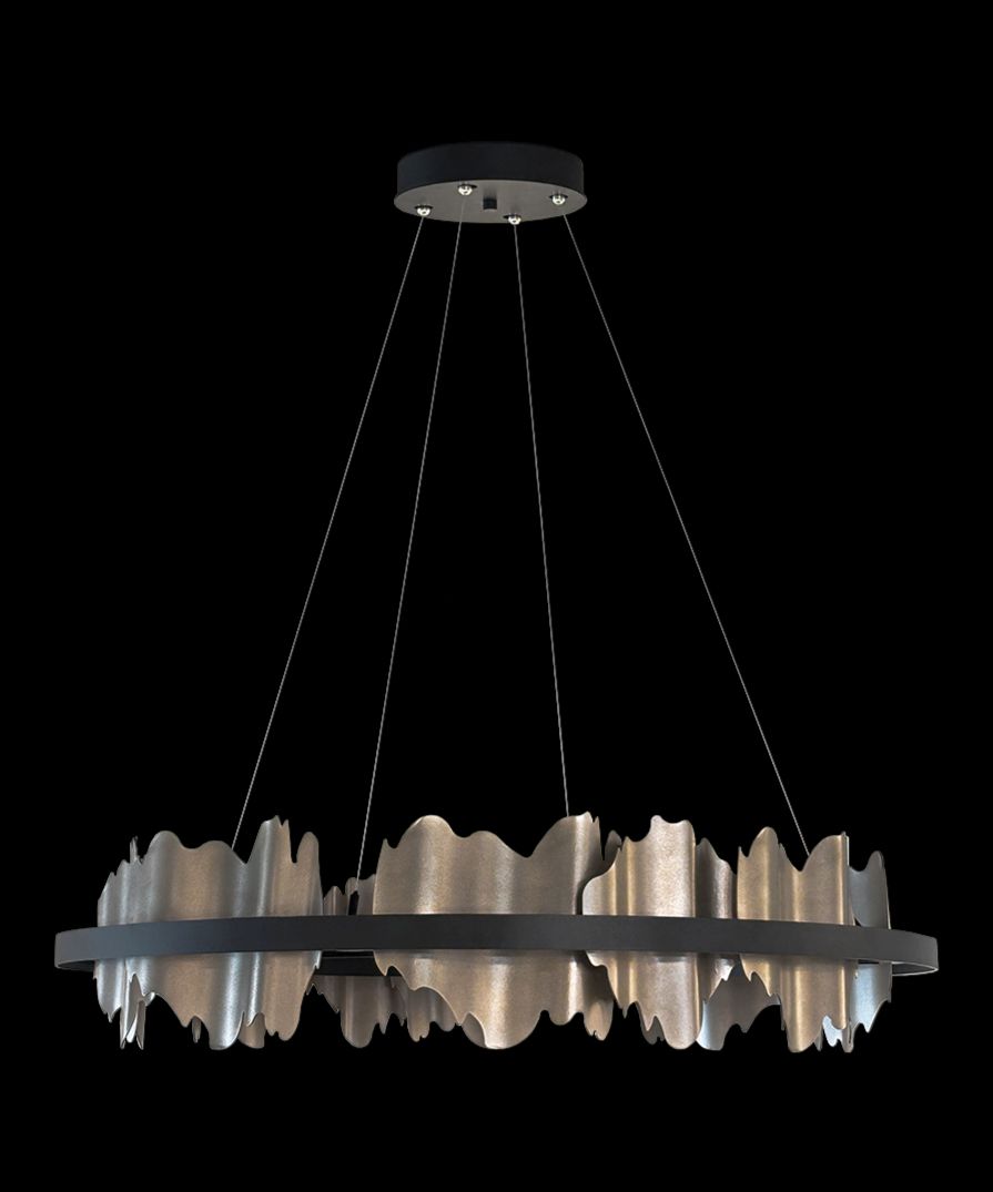 A circular pendant frame encases the discreet LED which illuminates light onto the curved metal plates designed using a forged process. The Ripple pendant is finished in Black with Soft Gold ripples . Other finish options are available on request.
