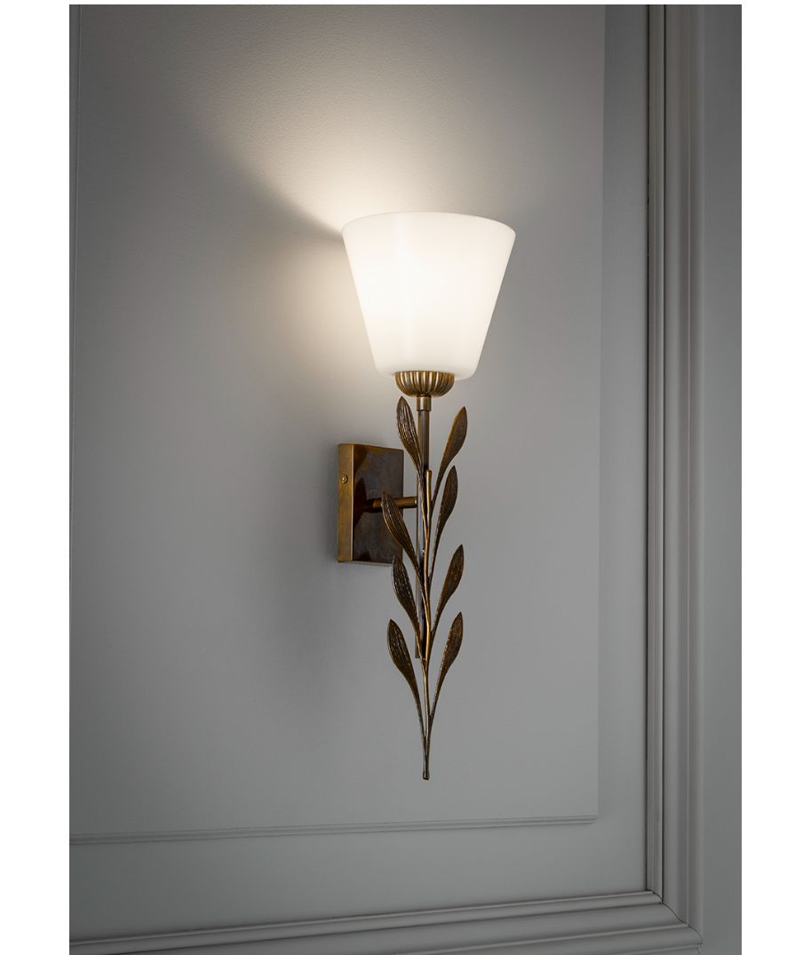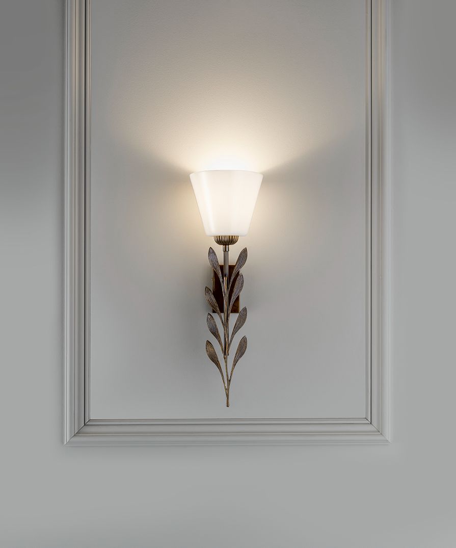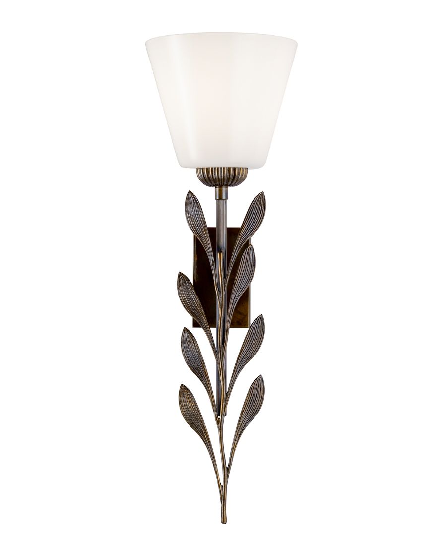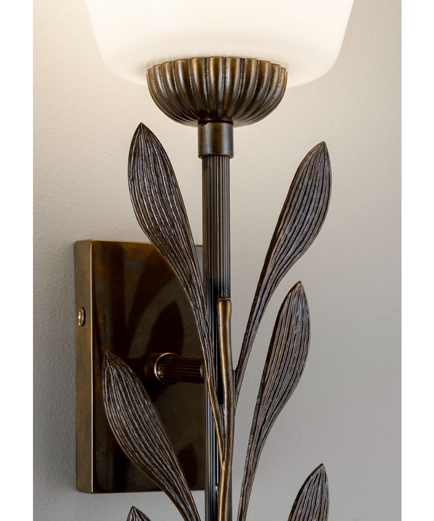 A decorative wall light with eight leaves detail and textured brass casting, in an antique bronze finish. Opal Glass lampshade.